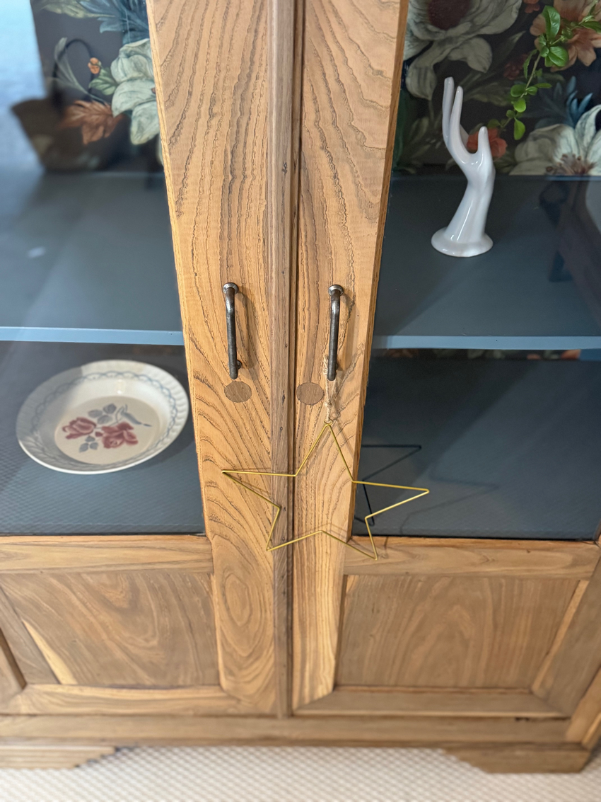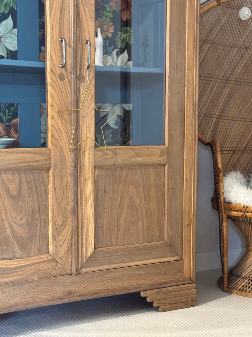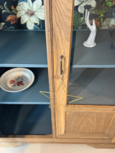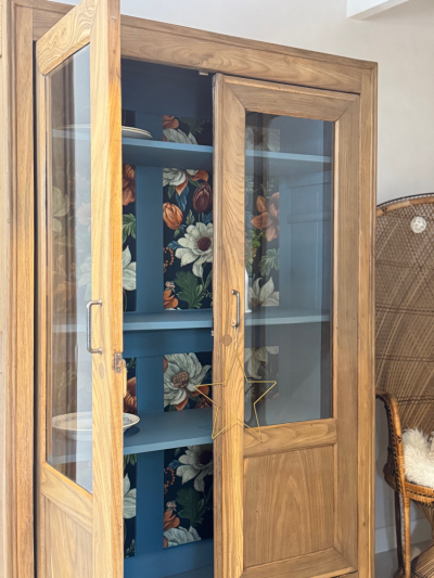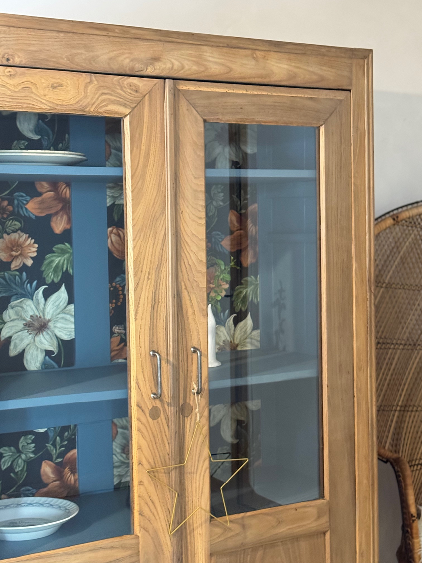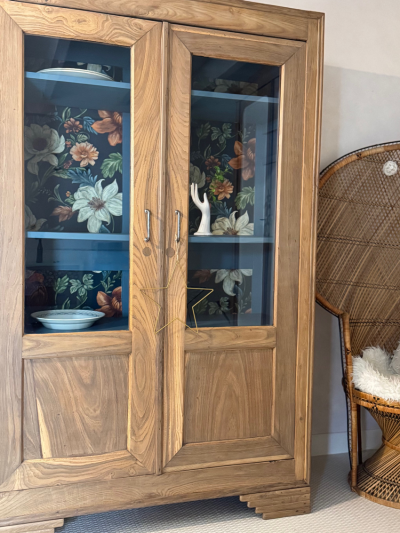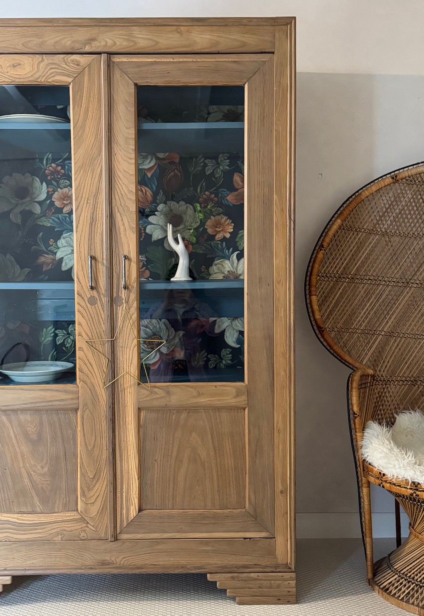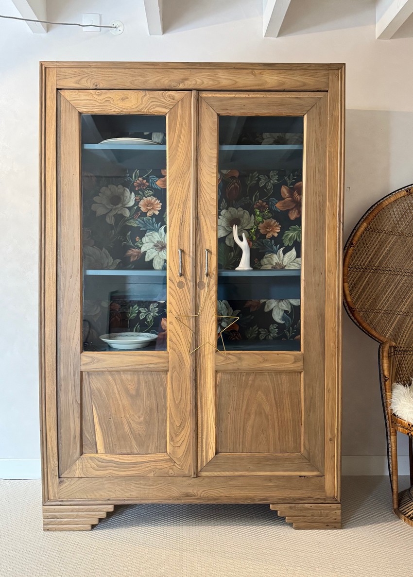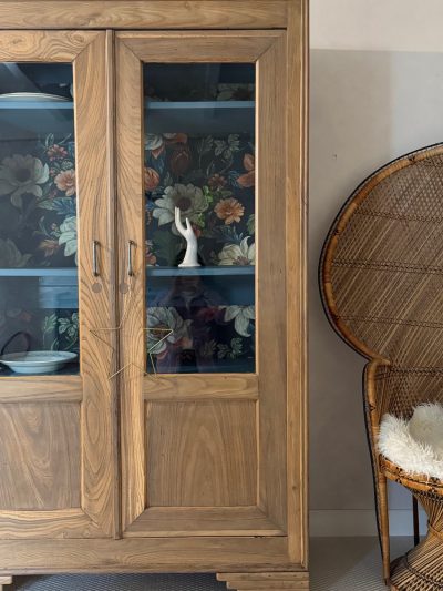 – Le fond du meuble a été tapissé d’un bel imprimé floral