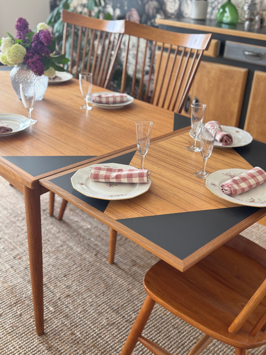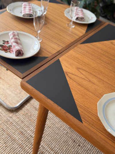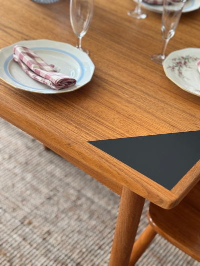 Cette table scandinave des années 60 a été entièrement restaurée dans notre atelier, avec une approche à la fois respectueuse et créative.